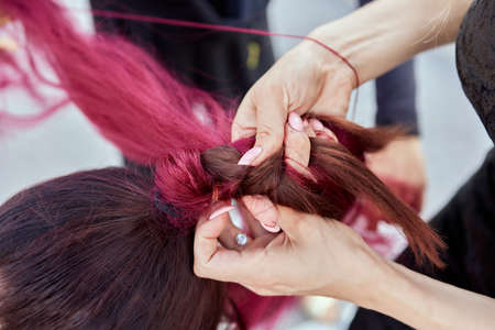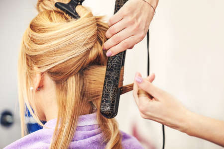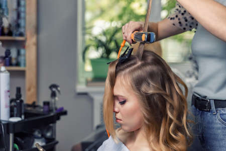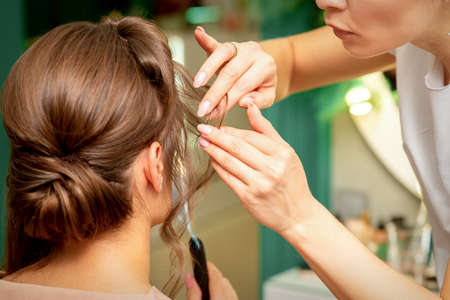 Close Up hairdresser stylist makes hairstyle for a young woman in a beauty salon