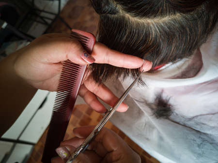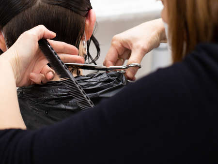 Closeup macro shot image of hairstylist hairdresser cutting customer woman hair in salon with scissors and comb, look from behind back side
