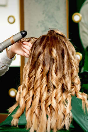 Close-up hairdresser twists the girl's long hair and makes curls. Creating a girl's hairstyle, a place for text, a hairdresser tool