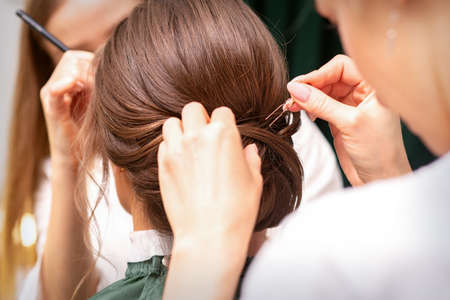 A hairdresser is making the hairstyle of a young brunette woman in a hair salon, close up