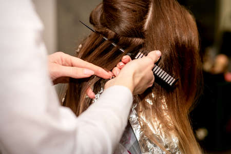 Hairdressers hands prepare brown hair for dyeing with a comb and foil in a beauty salon, close up