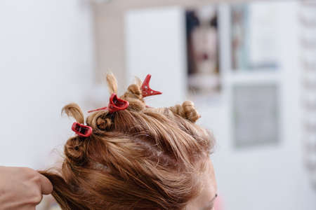 Master woman hairdresser gently curls hair curling girl in a beauty salon. Hair styling