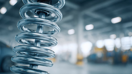 An intricate metallic coil spring assembly illuminated by gentle lighting, set against a bustling industrial setting with machinery and workstations in the backgroun