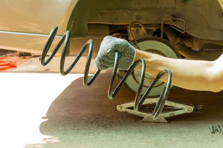 Chang Coil spring and shock absorber on the service shop change and remove old part car maintenance concept