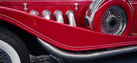 Close-up detail view of old classic vintage retro american supercharged muscle car red intake throttle valve on hood bonnet chrome horns mounted. Street power performance drag customs oldtimer auto