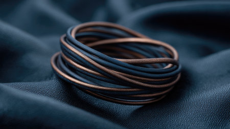 This close-up image features elegant intertwined copper and black wires resting on a smooth dark fabric surface, showcasing modern artistry and texture.
