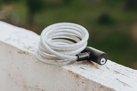 closeup of single curved spiral cable white wire. Phone line. Long distance connection. Technologies for staying in touch.