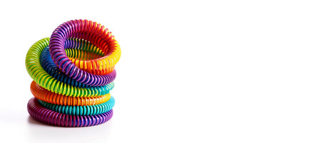 olourful slinky toy on white background. Rainbow toy on a white background with space for text. Multicolored coil spring. Plastic rainbow spiral tube. 3d render illustration