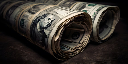 A row of rolled hundred dollar bills with rubber bands on dark background