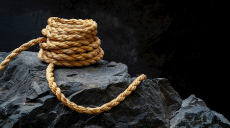 A coiled length of natural rope rests on a rugged dark rock surface, creating an artistic composition with dramatic lighting and shadows.
