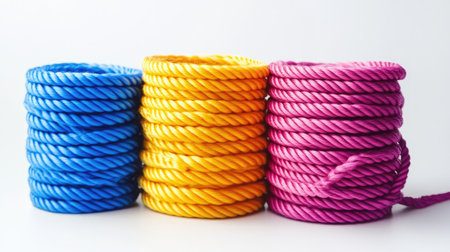 Brightly colored polyethylene rope rolls set against a white background for a clean, minimalistic stock photo.