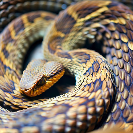 A close-up shot showcases the mesmerizing detail of a coiled snake, its scales shimmering with iridescent hues of brown, black, and blue
