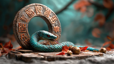 A turquoise snake coils around an ancient stone with engraved symbols, surrounded by autumn leaves, creating a mystical and enchanting atmosphere.