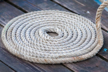 Roll of rough mooring rope. Rope mooring in a circle on a weathered wooden dock