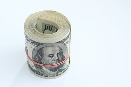 Rolled 100 dollars on white with copy space. American money.