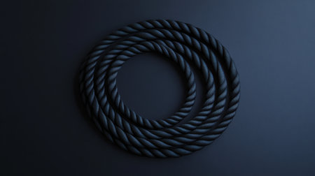 A black jump rope is neatly coiled in a spiral, resting on a smooth gray surface, creating a minimalist aesthetic with plenty of negative space.