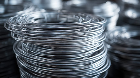 This close-up image showcases coiled metallic wire, highlighting its shiny texture and industrial application in manufacturing and construction settings. Perfect for commercial use.