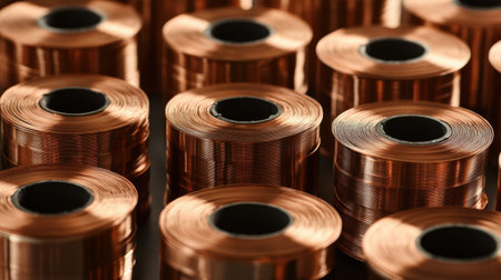 This image showcases a detailed arrangement of copper wire spools, highlighting the texture and color of copper in an industrial setting.