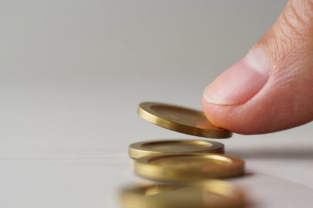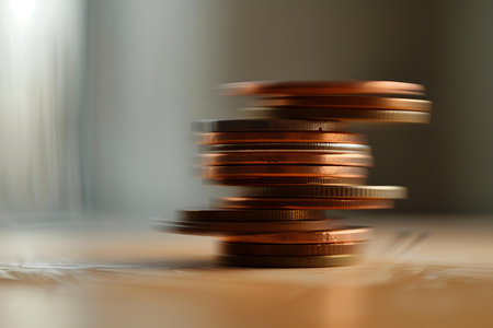 A close-up view of a hand placing a coin atop a stack of coins, representing the concepts of savings, investment, and financial growth in a sleek and minimalistic style.