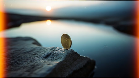 A coin is balanced upright on its edge, showing remarkable precision and skill.
