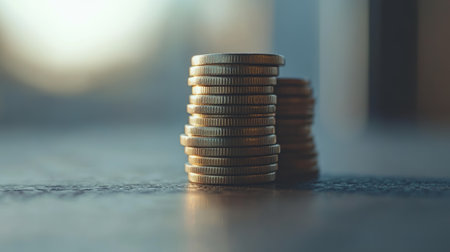Stacks of golden coins symbolize increasing investment, savings, and financial growth, with a blurred background suggesting a focus on long term financial planning