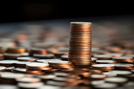 A stacked coins illuminated by dramatic lighting create striking visual effect, showcasing texture and shine of metal. this close up captures essence of wealth and finance