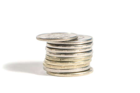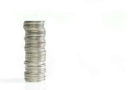 Business/ showing increasing stacks of copper and silver coins arranged in a staircase pattern on a white background...