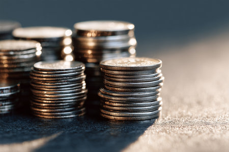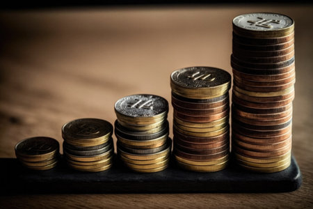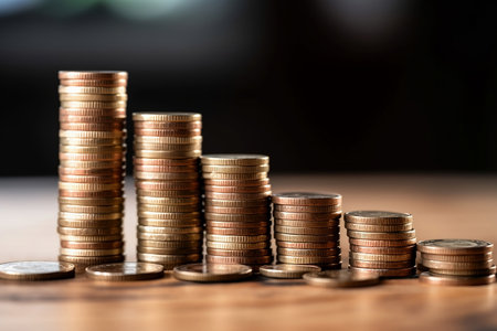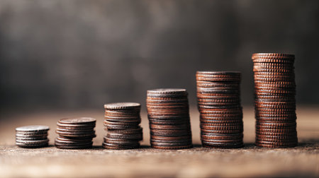 A visually striking image of stacks of coins arranged in a line on a dark wooden surface, highlighting themes of finance, growth, and investment.