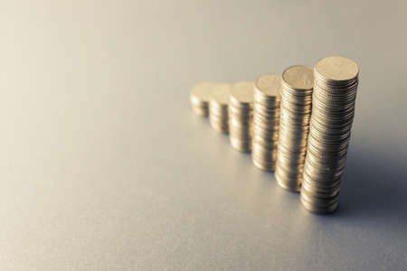 Stacks of coins in a growing progression. Background with copy space for text or inscriptions. Business economic development concept