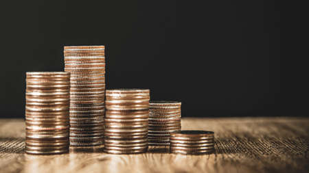 Concept of collecting money, saving money, and managing money. The piles of coins are arranged in order of height.