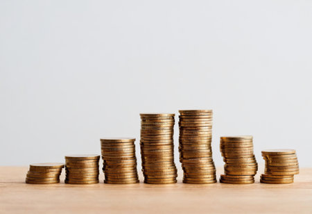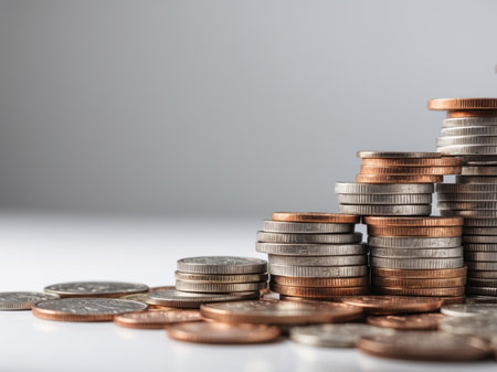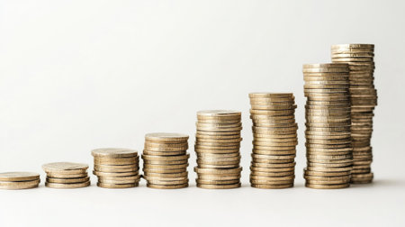 Stacks of coins arranged in ascending order, showcasing variety of colors and sizes. image symbolizes financial growth and investment, with neutral background enhancing focus on coins