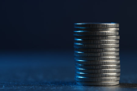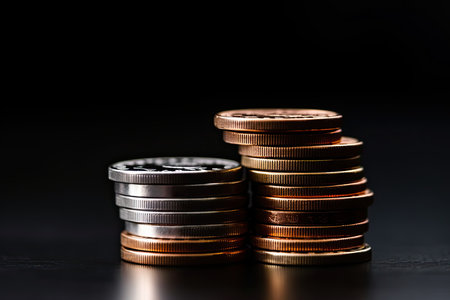 Stacked coins in various denominations create visually appealing arrangement, showcasing metallic textures and colors of currency. image evokes sense of value and finance