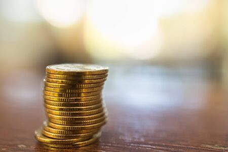 Business, Money, Finance, Security and Saving Concept. Close up of stack of gold coins on wooden table under sunlight with copy space.