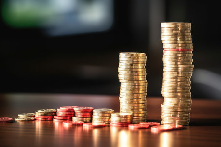 Columns of coins, slowly adding up. Saving money. Generative AI
