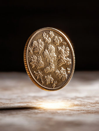 A close-up shot features a golden coin showcasing a detailed tree design. The coin is positioned on a reflective surface, possibly water, enhancing the visual effect with its mirrored image. The lighting appears soft and warm, highlighting the texture and intricate details. Suitable for commercial and editorial applications, this image can be used to represent concepts.
