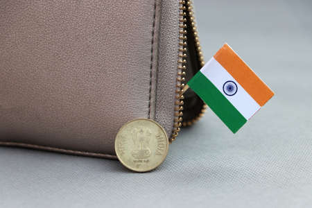 Five Rupee money coin of India and mini Indian flag stick on the leather wallet on grey background. Concept of finance or currency.