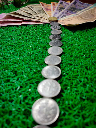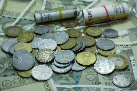 Indian Paper Money at indoor with placing coins at indoor