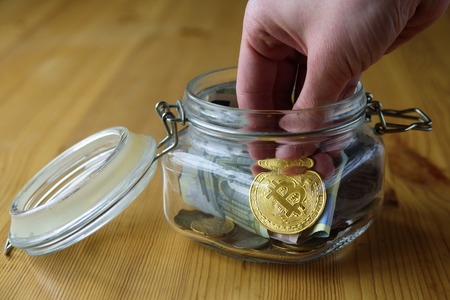 Money jar and bitcoin into it. Hand putting coin in jar