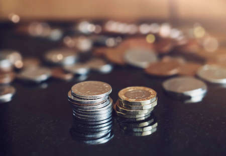 Two stack New pound coins with blurry penny background, British money on table, Selective focus GBP coins on the floor in dark light, Business and financial for money saving or investment concept