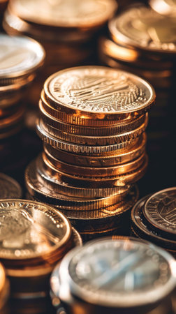 Stacked coins in various denominations create visually appealing arrangement, showcasing metallic textures and colors of currency. image evokes sense of value and finance