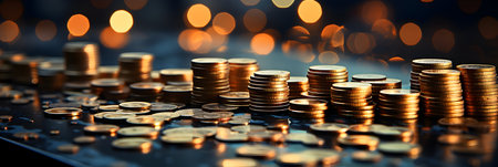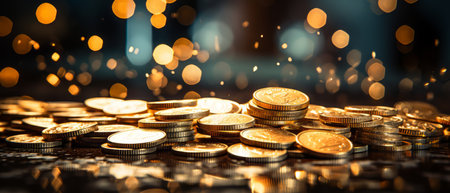 Piles of shiny gold coins stacked high, symbolizing wealth, savings, and financial prosperity.