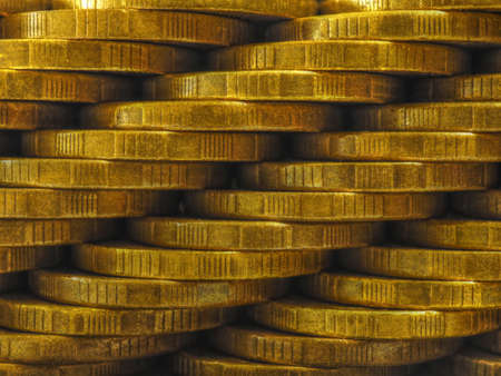 Stack of golden coins macro. Rows of coins for finance and banking concept. Economy trends background for business idea.