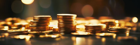 Rows of stacked golden coins with a soft bokeh background, symbolizing wealth, finance, and financial growth.