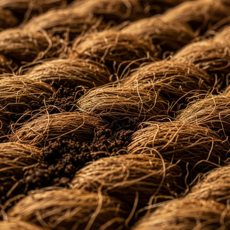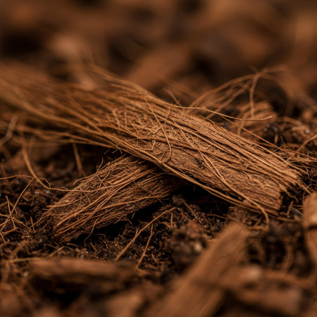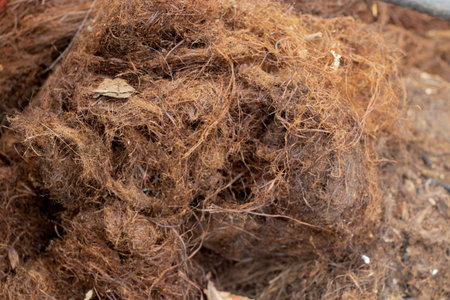 Closeup of natural coconut coir fibers intertwined over rich soil, showcasing organic texture and raw plant material detail.