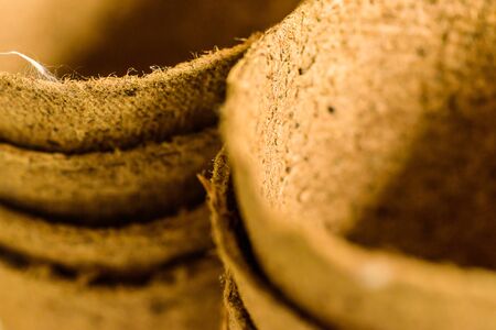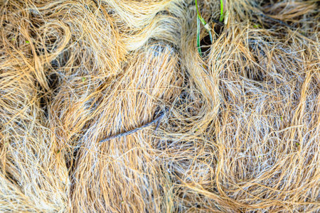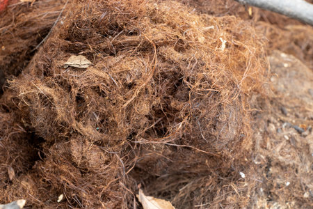 Close-up of dirty, old brown vegetable fiber for insulation, sealing cracks, furniture padding, and packaging production