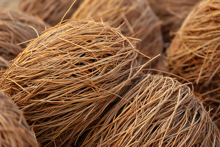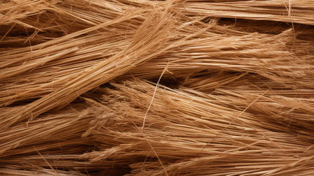 Close up of natural brown coconut coir fibers intertwined in organic texture for eco friendly materials and sustainable crafts.