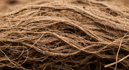 A detailed view of a coarse, natural fiber bundle featuring complex interlacing strands and warm earthy tones, emphasizing its rich, tactile surface and layered structure.