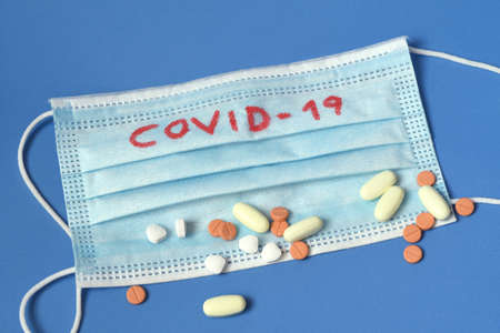 Surgical mask for protection against viruses and medicines pills on blue background, with the words COVID-19.