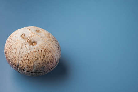 Whole coconut on a blue background. Place for text.