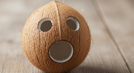 AI Generated. Two coconuts sit side by side on a white surface One is split in half